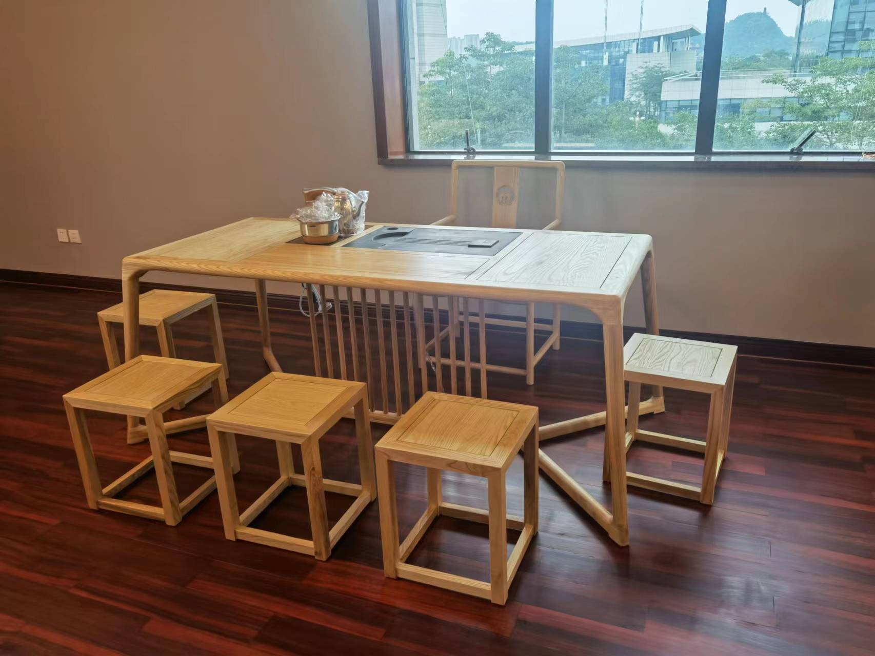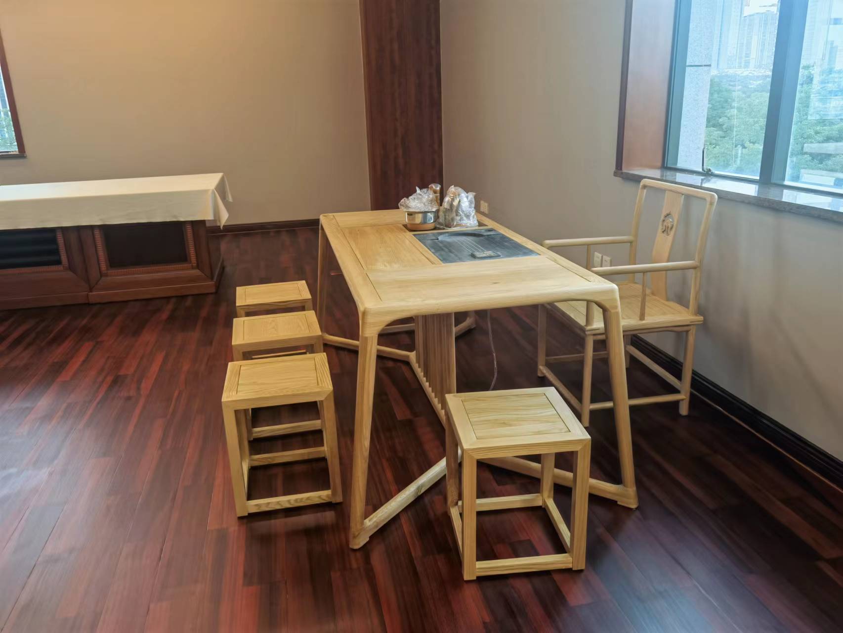 基材:白腊木,颜色可定制。配一张主人椅,配五张方凳。